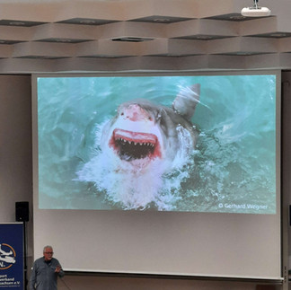 Unteranderem hielt Gerhard Wegner, Gründer Sharkproject e.V. , Autor und Fotograf, einen spannenden Fachvortrag. Das durch Angst geprägte Bild des Haies als menschenfressendes Monster, wiederlegts er mit umfangreichen Erklärungen zum Verhalten des Haies wissenschaftlich und auf unterhaltsame Art und wies eindrucksvoll auf die Notwendigkeit des Schutzes der Tiere hin.